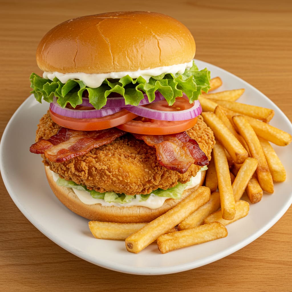 Pollo crispy, lechuga, cebolla morada, Bacon, Tomate y mayonesa con patatas.