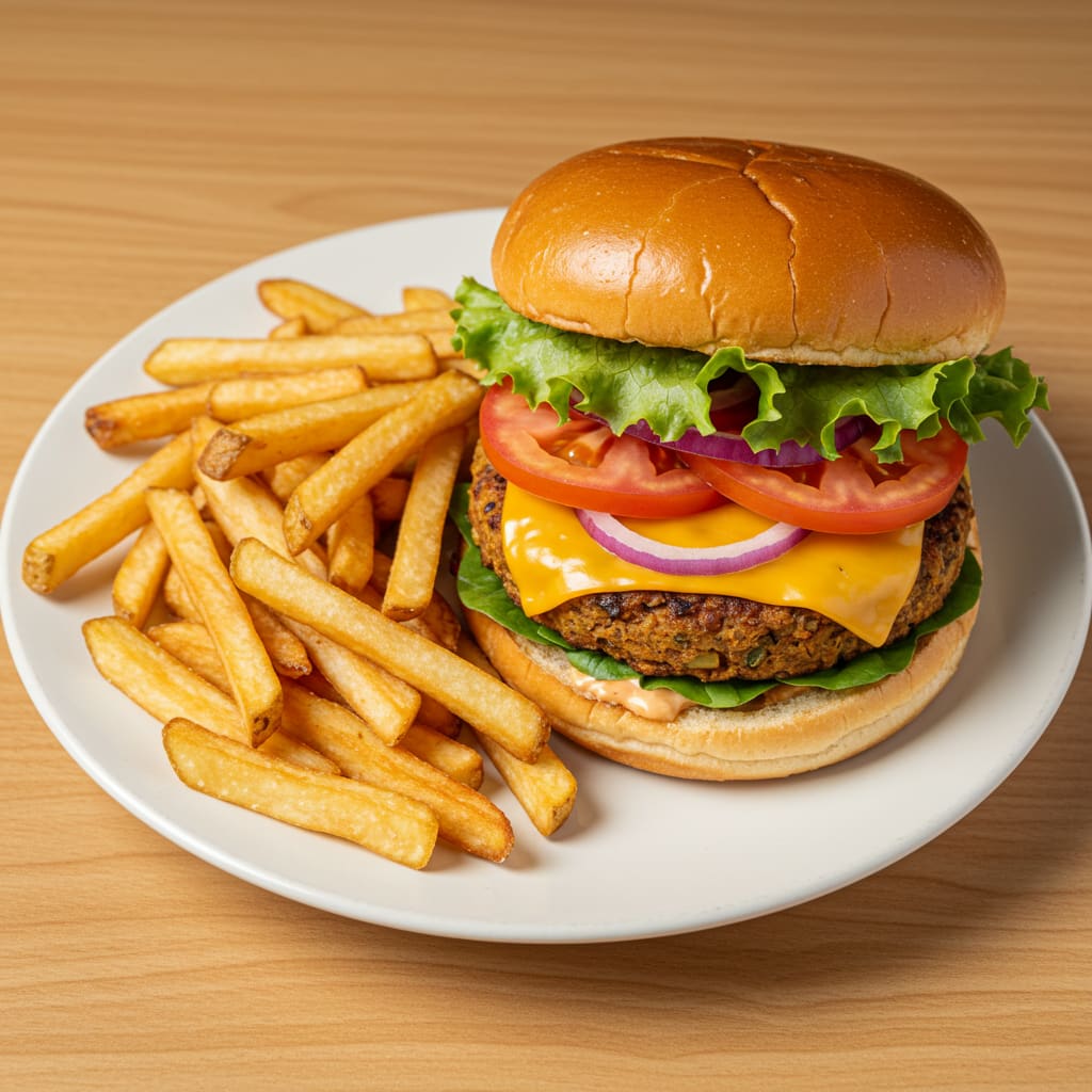 Hamburguesa de lentejas, lechuga, cebolla, tomate y queso con patatas.